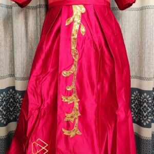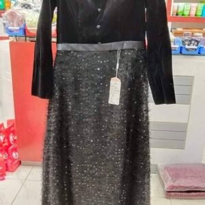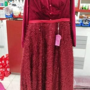 Red-golden Lace Panel Sequin Work Long Sleeve Dress