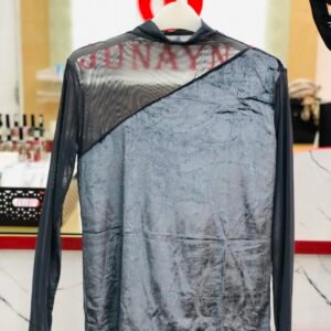 Velvet Half-high Collar Mesh Long-Sleeved Splicing Temperament Slim-Fit Bottoming T-shirt - Ash