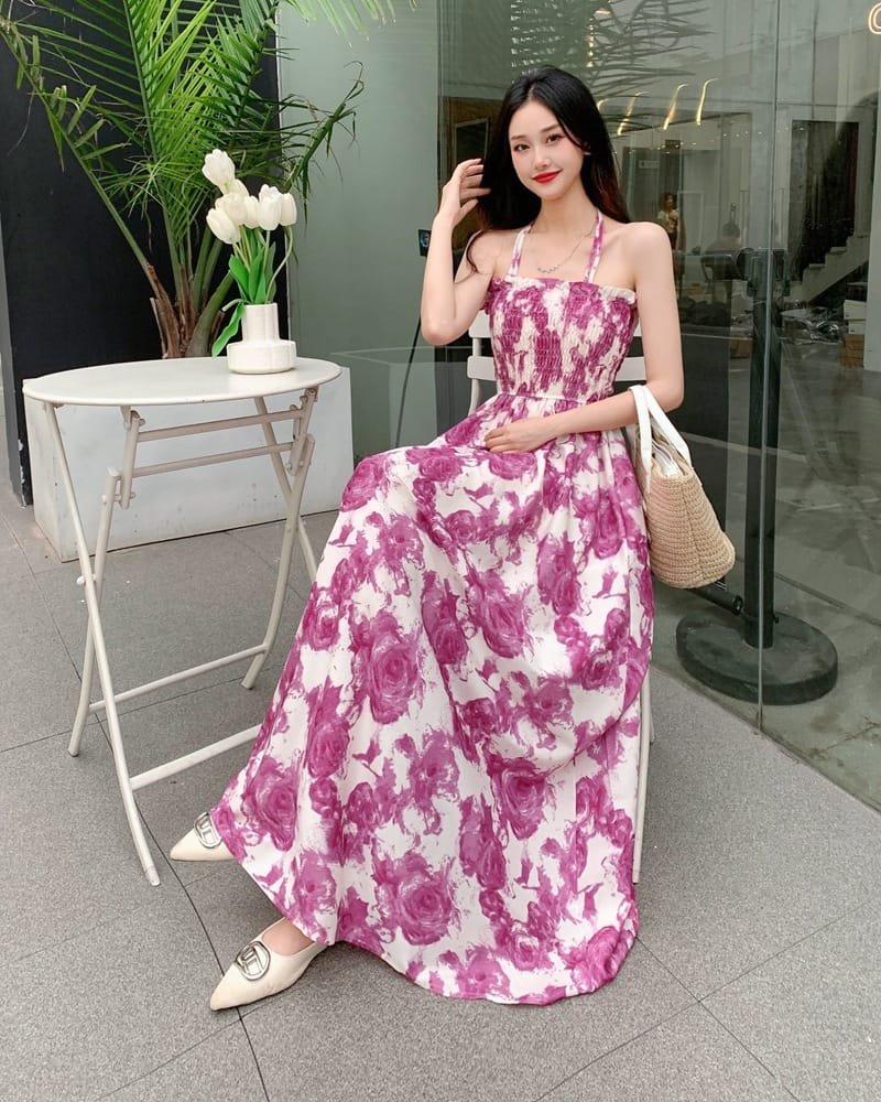 Floral Pattern Sling Dress (White Pink)